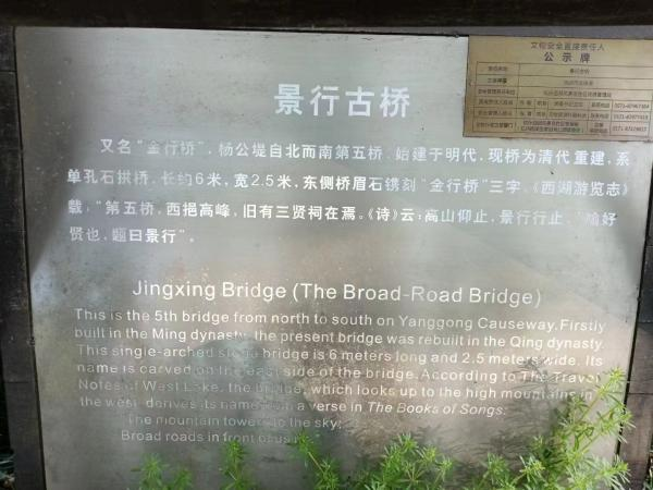 在杭州西湖花港公园内,还留有一段旧的杨公堤残堤。走到尽处,有一座小的古石桥,名景行桥,为原杨公堤的第五桥。因湖边有先贤祠,取“高山仰止,景行行止”之意,以慕先贤。