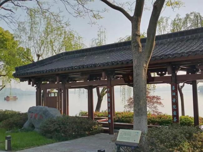 白居易曾做杭州刺史,对杭州西湖做出了显著的贡献。据苏轼《钱塘六井记》载:“唐宰相李公长源始作六井,引西湖水以足民用。其后刺史白公乐天治湖浚井,刻石源上,至于今赖之。”他不仅兴修水利,浚西湖,筑白公堤,改造了西湖的景观;而且作诗词展示杭州及西湖的美景。如:《钱塘湖春行》“孤山寺北贾亭西,水面初平云脚低。几处早莺争暖树,谁家新燕啄春泥。乱花渐欲迷人眼,浅草才能没马蹄。最爱湖东行不足,绿杨阴里白沙堤。”《忆江南词》:“江南好,风景旧曾谙;日出江花红胜火,春来江水绿如蓝。能不忆江南?江南忆,最忆是杭州;山寺月中寻桂子,郡亭枕上看潮头。何日更重游!江南忆,其次忆吴宫;吴酒一杯春竹叶,吴娃双舞醉芙蓉。早晚复相逢!”他对杭州江湖美景的推崇,使杭州名声超过苏州,从此奠定了江南第一大都会的声望。所以白居易去世后,人们在西湖边孤山广化寺造竹阁,专门立祠纪念。据淳祐《临安志》载,陈文帝天嘉二年(561年)建广化寺,尝植三柏。僧作堂于其侧,名柏堂,堂与白居易竹阁相连。白居易曾有诗:“晚坐松檐下,宵眠竹阁间。清虚当服药,幽独抵归山。巧未能胜拙,忙应不及闲。无劳别修道,即此是玄关。”